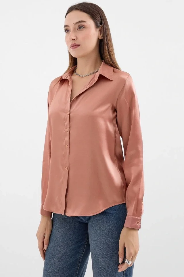 3964 Hafif Dökümlü Saten Gömlek - Camel