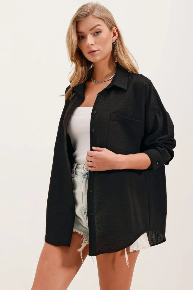 20153 Tek Cepli Oversize Keten Gömlek - Siyah