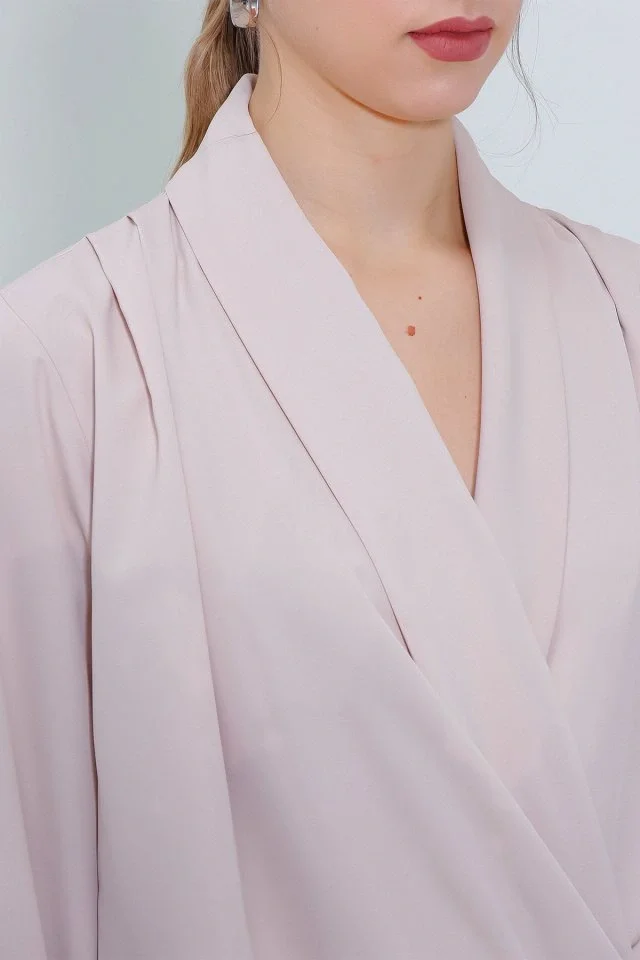 Krem Kruvaze Yaka Dökümlü Saten Bluz 0492