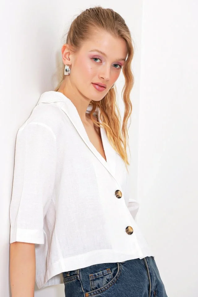 Beyaz Çift Düğmeli Oversize Crop Keten Ceket 0706