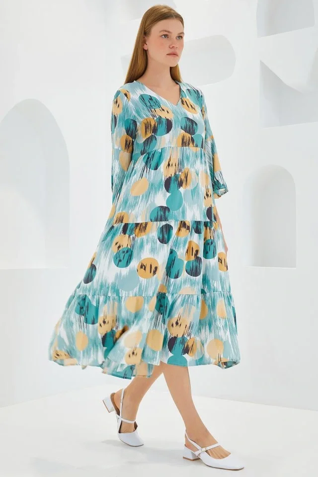 Mint Bej Desenli Kısa Kol Viskon Elbise 1959