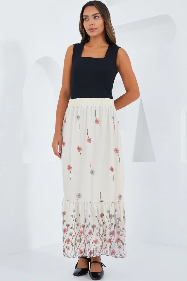 Ekru Desenli Şifon Etek 8010
