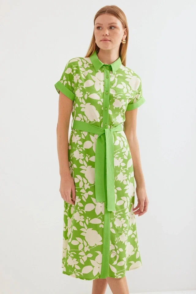 Önü Çiçek Nakışlı Yuvarlak Yaka Salaş Penye Tunik -Yeşil