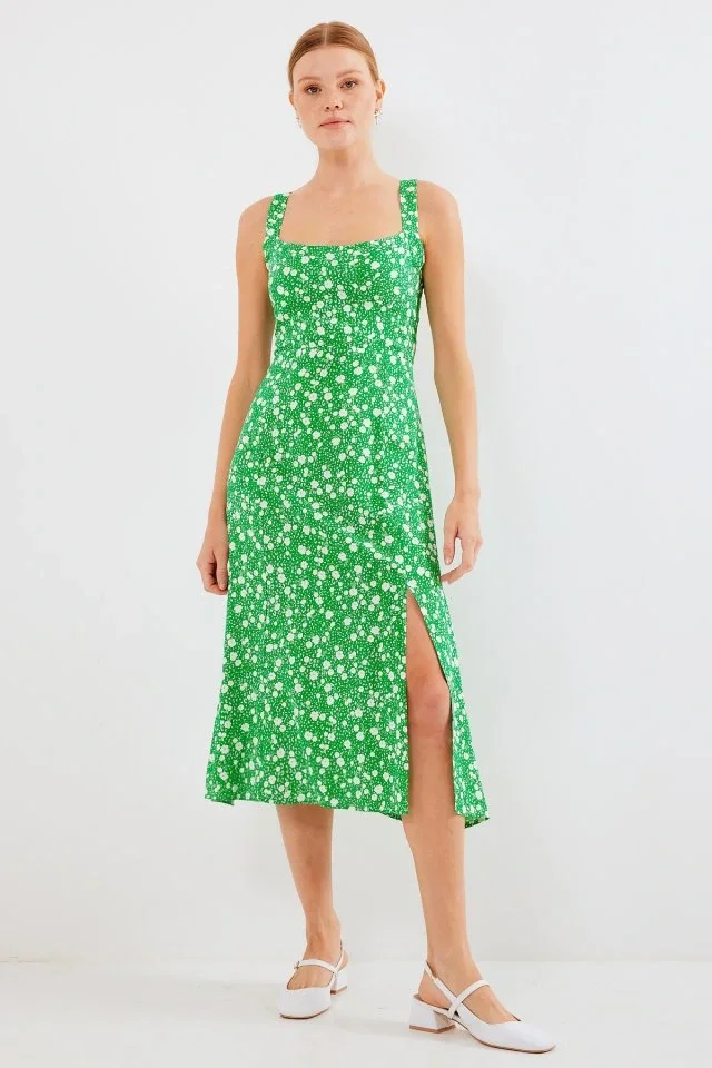 2282 Yırtmaçlı Askılı Viskon Elbise - Yeşil