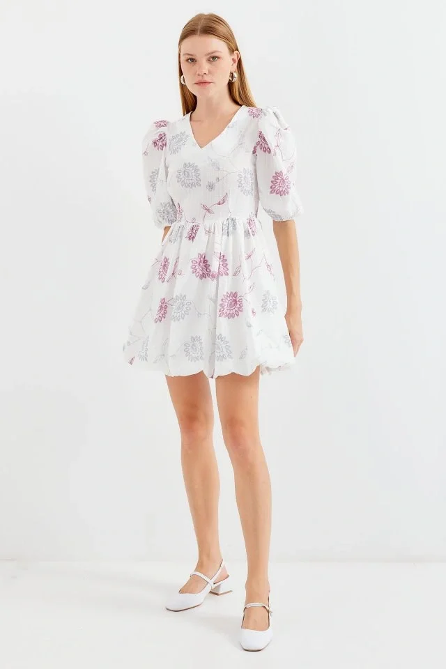 2506 Desenli V Yaka Mini Kloş Elbise - Ekru