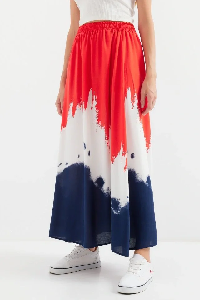 8025 Desenli Uzun Viskon Etek - Kırmızı