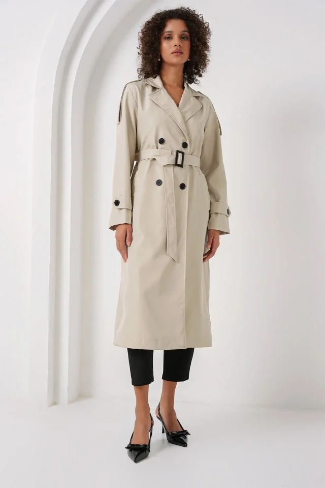 5941 Kruvaze Yaka Uzun Trençkot - Taş