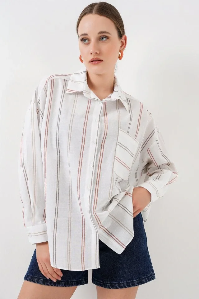 Çizgili Oversize Gömlek 20278 - B.Beyaz