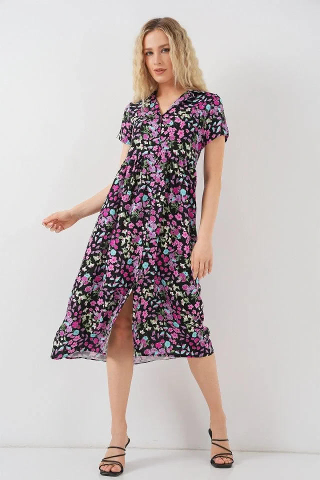 Boydan Düğmeli Kısa Kol Çiçekli Elbise 2561 - Siyah