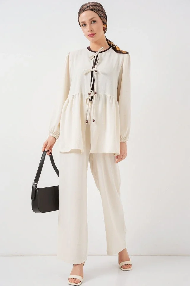 Önü Bağcıklı Tunik Pantolon İkili Takım 6744 - Ekru