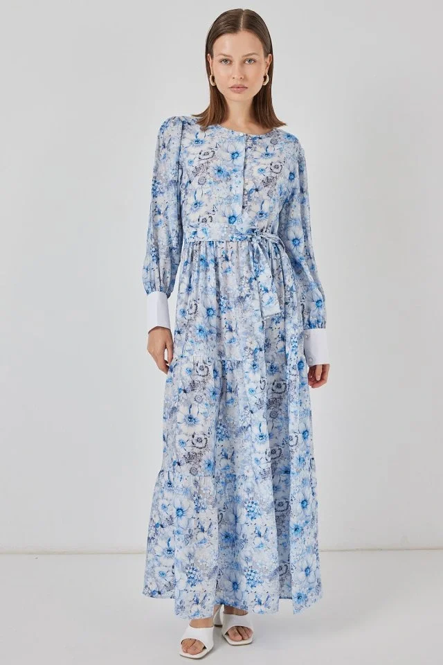 Kuşaklı Uzun Elbise 2584 - Mavi