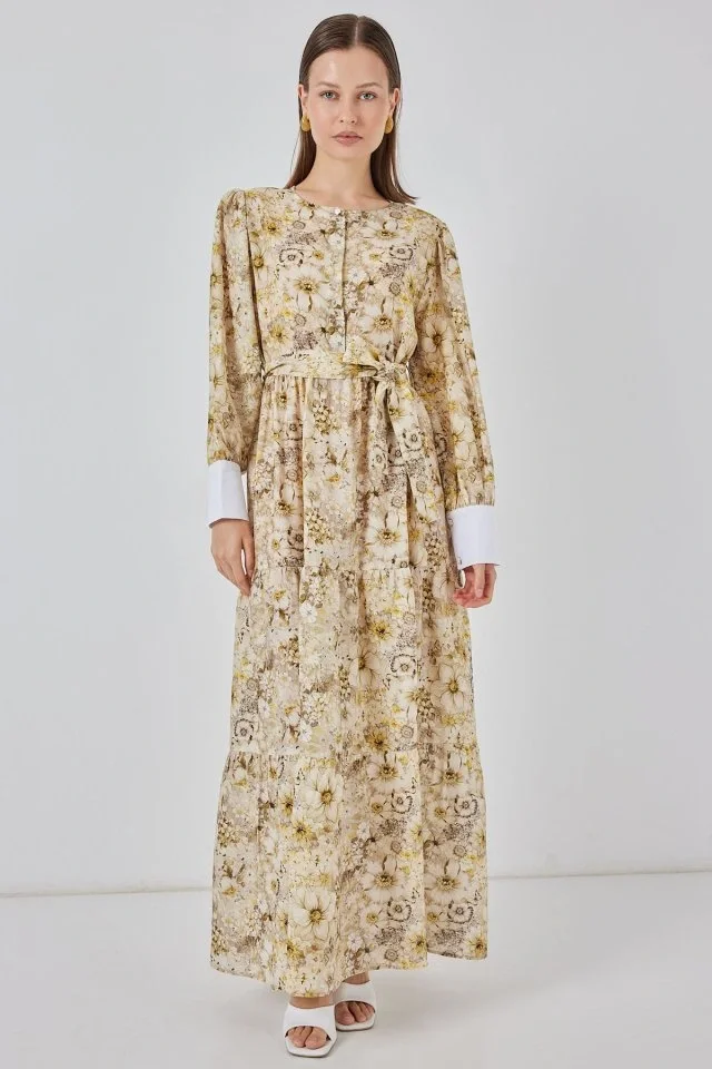 Kuşaklı Uzun Elbise 2584 - B.Sarı