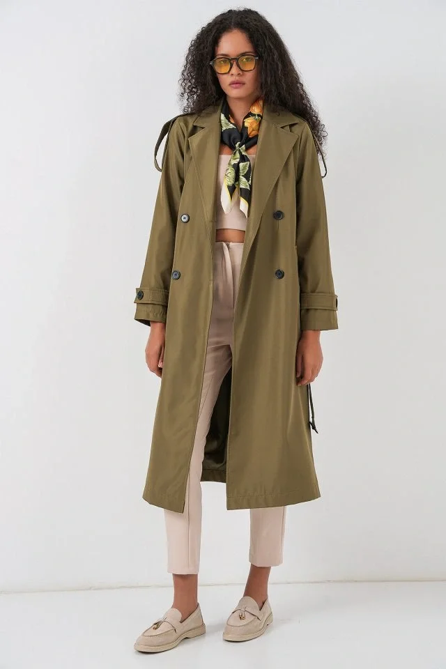 5941 Kruvaze Yaka Uzun Trençkot - Haki