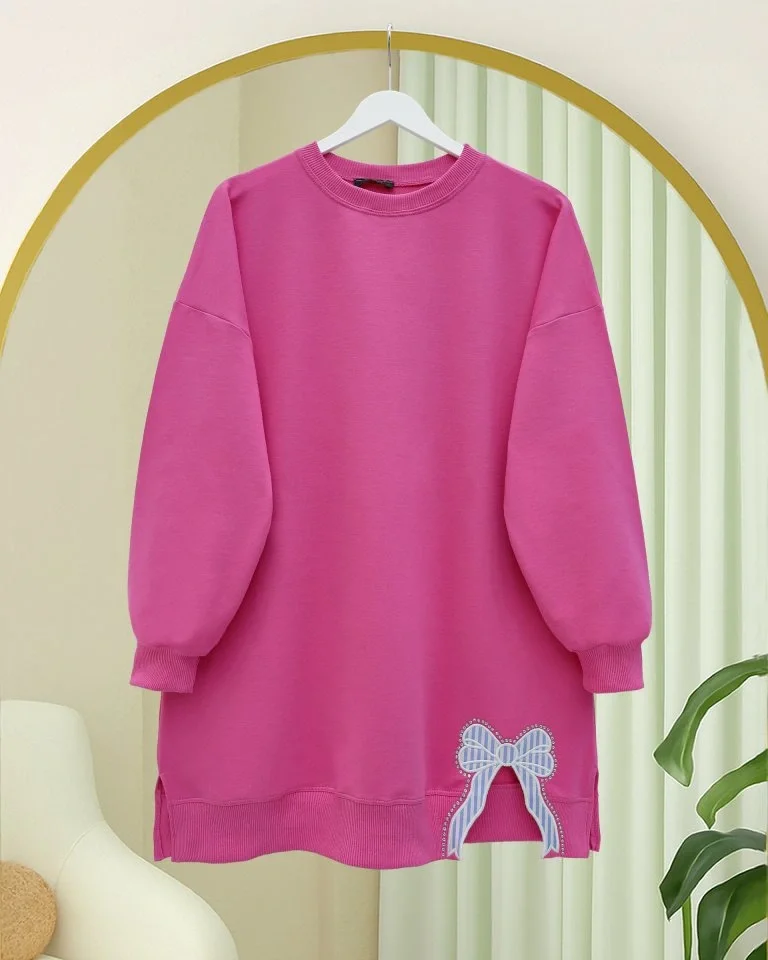Yuvarlak Yaka Eteği Fiyonk Detaylı Salaş Penye Tunik -Pembe