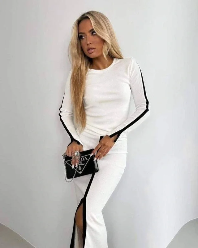 Kadın Uzun Kollu Bisiklet Yaka Kaşkorse Bluz Ve Yırtmaçlı Etek Ikili Takım