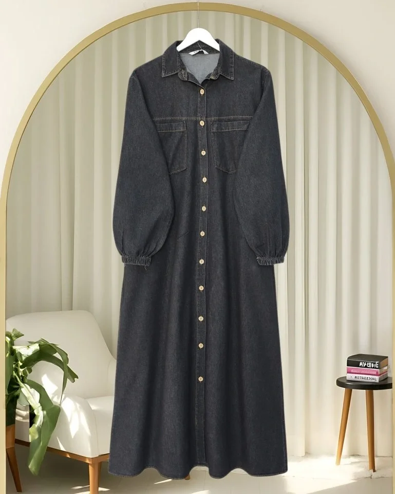 Boydan Düğmeli Kolu Lastikli Cepli Kot Elbise -Antrasit