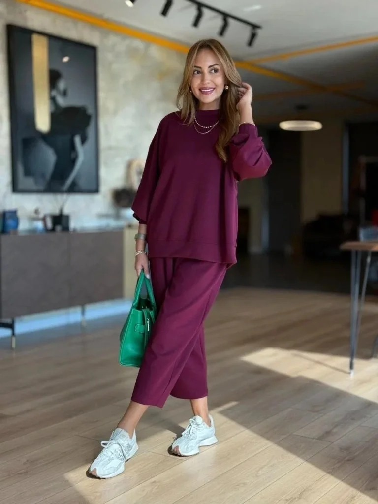 Kadın Uzun Kollu Bisiklet Yaka Viskon Iki Iplik Mor Bluz Ve Pantolon Ikili Takım