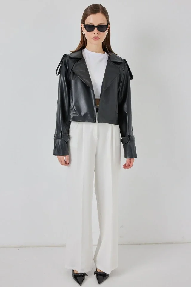 Kadın Uzun Kollu önü Açık Deri Ceket Ve Askılı Yuvarlak Yakalı Mini Elbise Ikili Takım