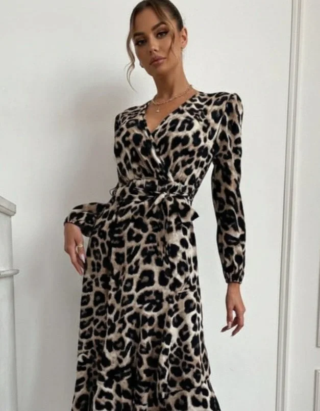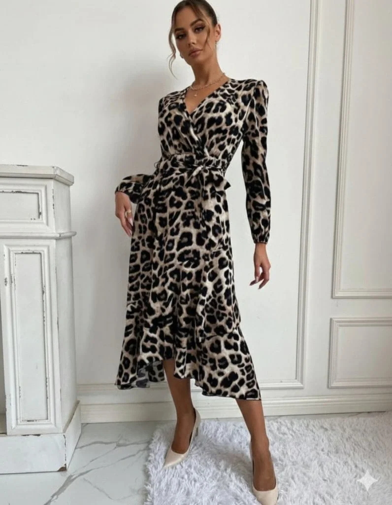 Kadın Uzun Kollu Kruvaze Yaka Yandan Bağlamalı önden Fırfır Detaylı Süprem Uzun Elbise