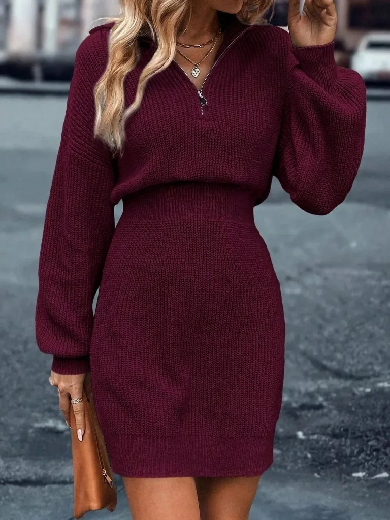 Kadın Uzun Kollu Yakası Fermuarlı Mini Triko Elbise