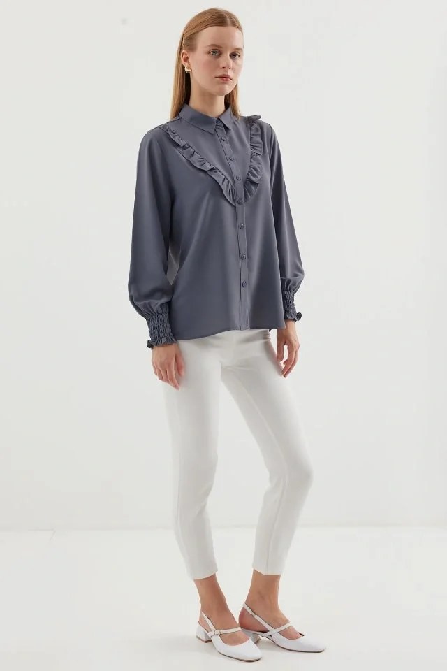 20223 Fırfırlı Uzun Kol Gömlek - Gri