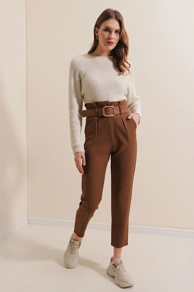 6556 Kemerli Kumaş Pantolon - Kahverengi