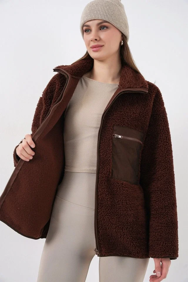 55446 Fermuarlı Oversize Peluş Ceket Mont - Kahverengi