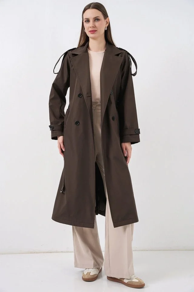5941 Kruvaze Yaka Uzun Trençkot - Kahverengi