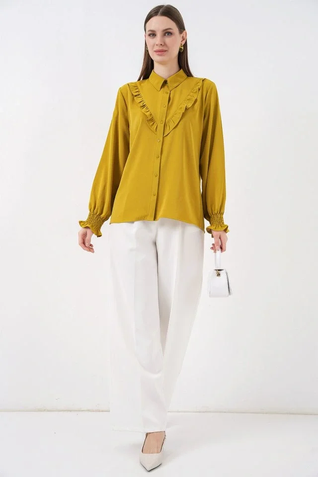 20223 Fırfırlı Uzun Kol Gömlek - Hardal