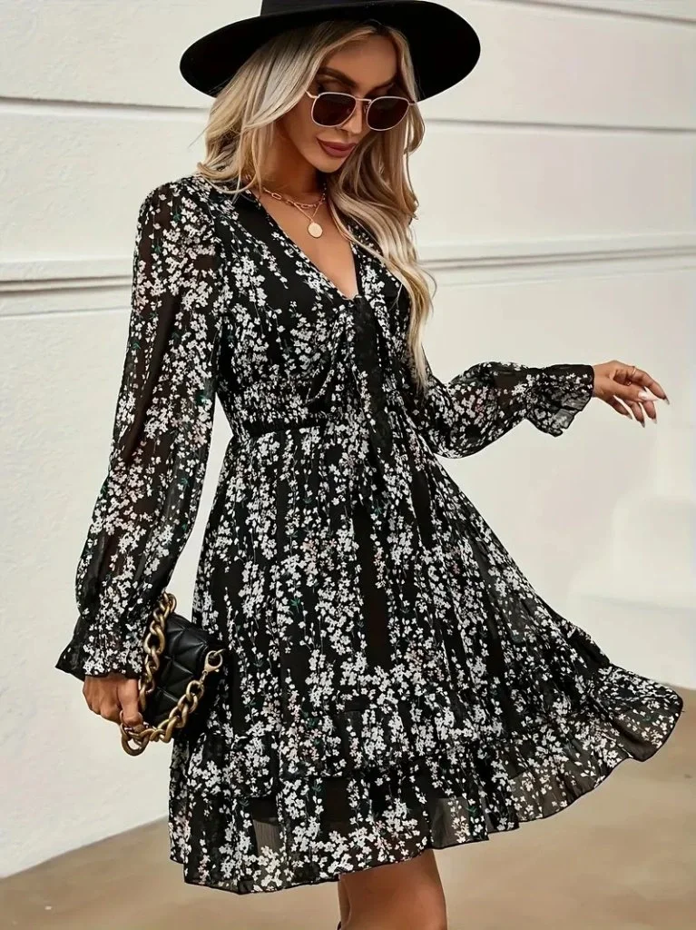 Kadın Uzun Kollu V Yakalı Fırfırlı Ve Bağcıklı şifon Mini Elbise