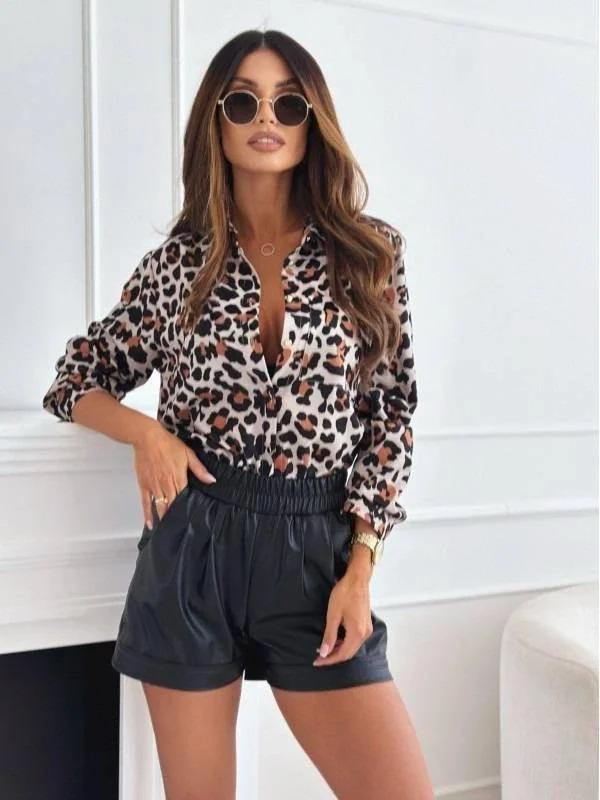 Kadın Uzun Kol Cep Detay Leopar Baskılı Mosskrep Kumaş Gömlek