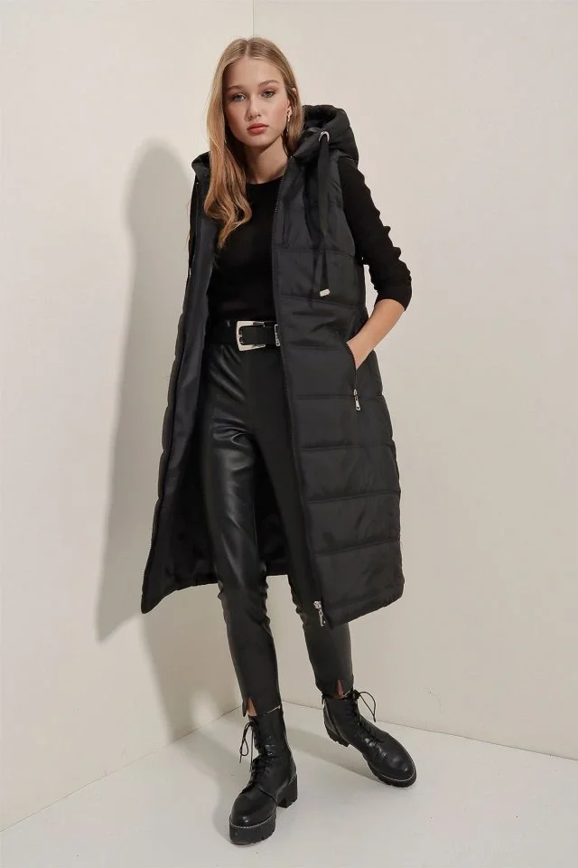 5140 Kapşonlu Uzun Şişme Yelek - Siyah