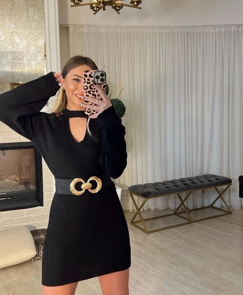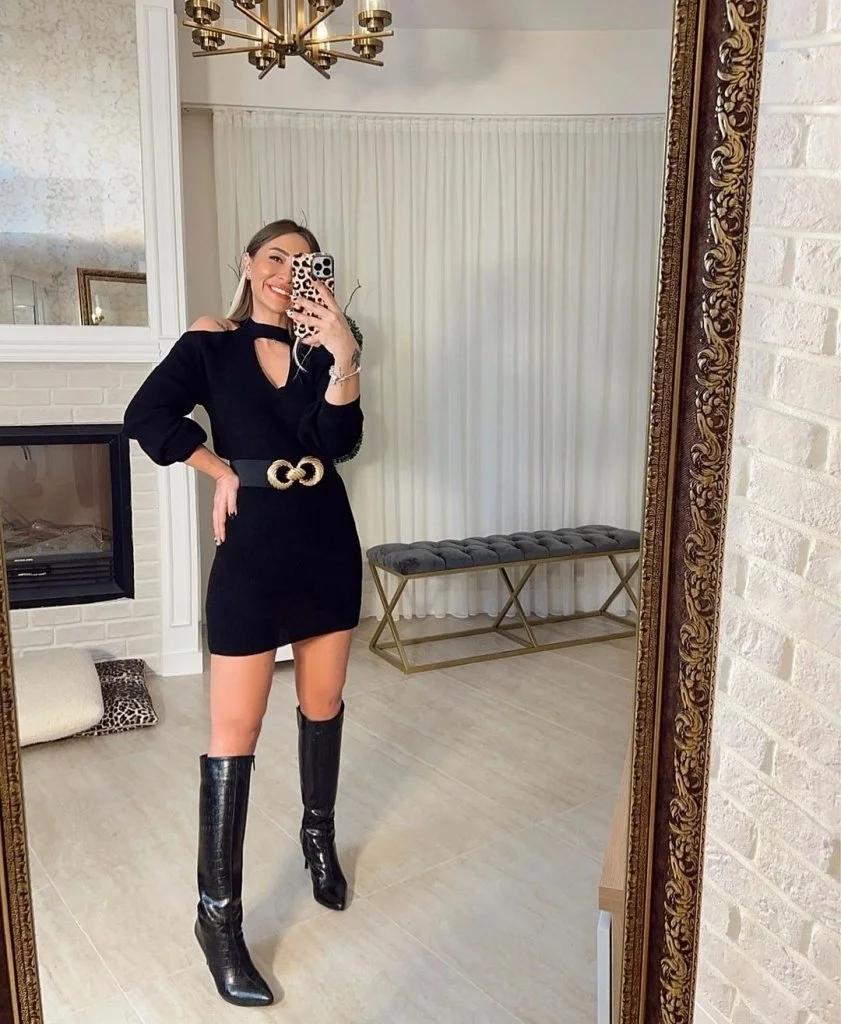 Kadın Uzun Kollu Omuzları Açık Boyundan şerit Detay Kaşkorse Elbise