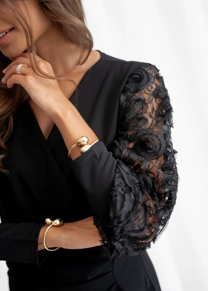 Kadın Uzun Kollu Kruvaze Yakalı önden çapraz Detaylı Kolları çiçek Dantel Detaylı Mini Ithal Krep Elbise