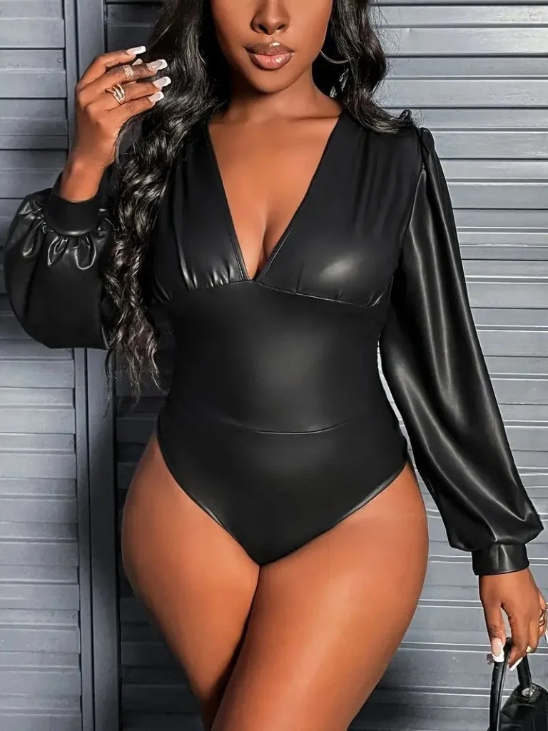 Kadın Uzun Kollu Derin V Yakalı Deri Zıbın