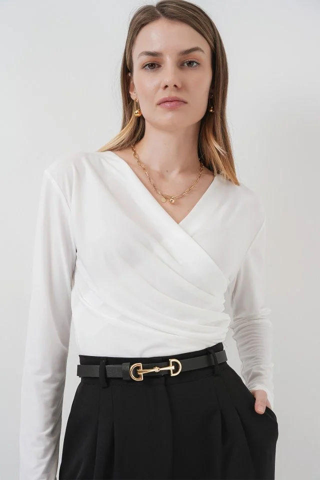 939 Anvelop Yaka Sandy Bluz - Beyaz