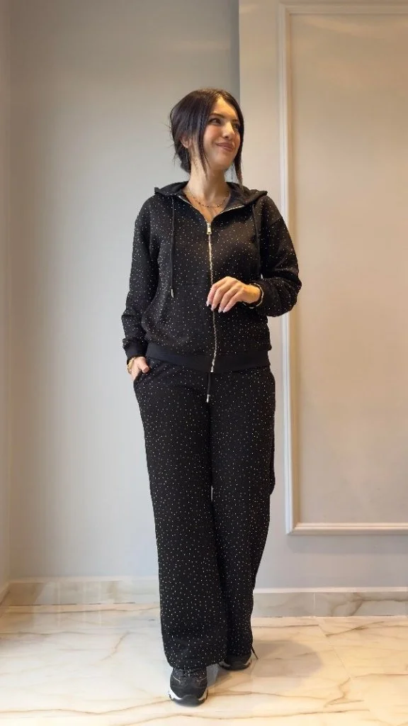 Kadın Uzun Kollu Kapşonlu Fermuarlı Taşlı önü Fermuarlı Viskon Iki Iplik Bluz Ve Eşofman Altı Ikili Takım