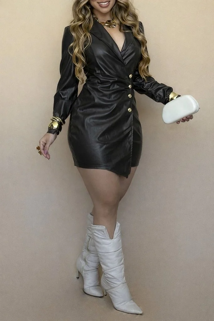 Kadın Uzun Kollu Kruvaze Yakalı önden Büzgü Ve Düğmeli Asimetrik Kesim Detaylı Mini Deri Elbise