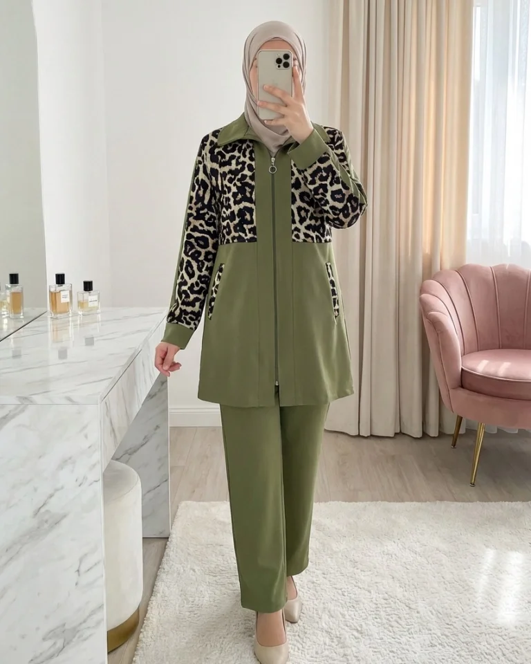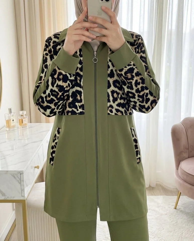 Gömlek Yaka Boydan Fermuarlı Pantolonlu Takım -Haki