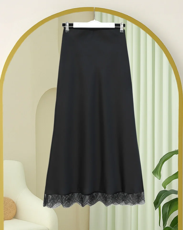 Ucu Dantel Detaylı Saten Etek -Siyah