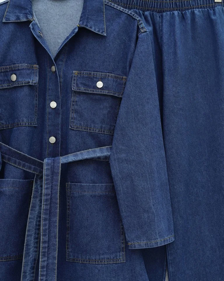 Beli Kemerli Cepli Önü Düğmeli Kot Takım -İndigo