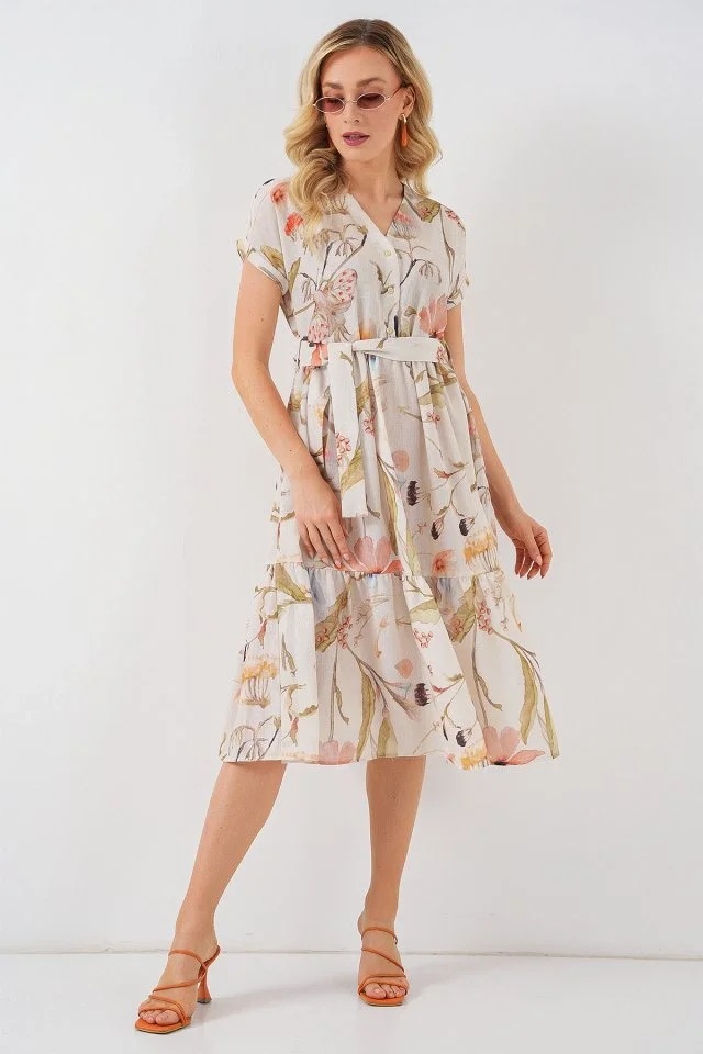 Desenli Kısa Kol Elbise 2558 - Krem