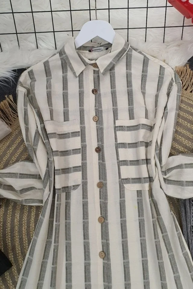 Önü Kurdele Detaylı Düğmeli Önlük Yaka Gömlek -Çağla Y.