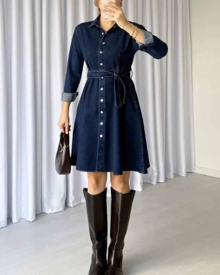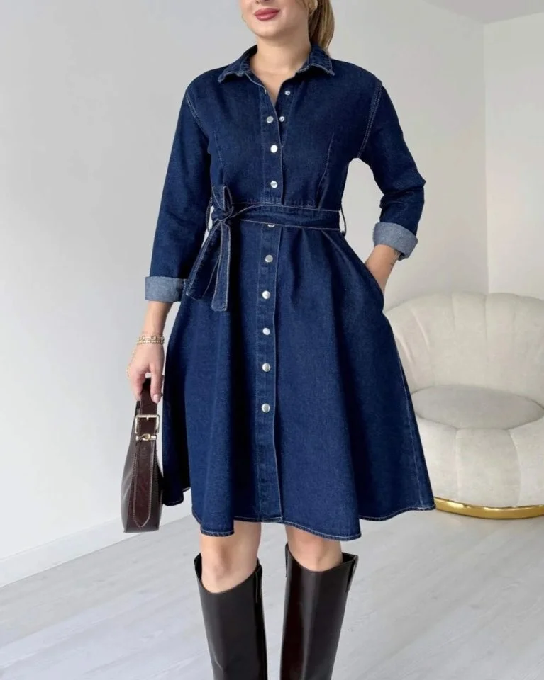 Boydan Çıtçıtlı Kemerli Kot Elbise -İndigo