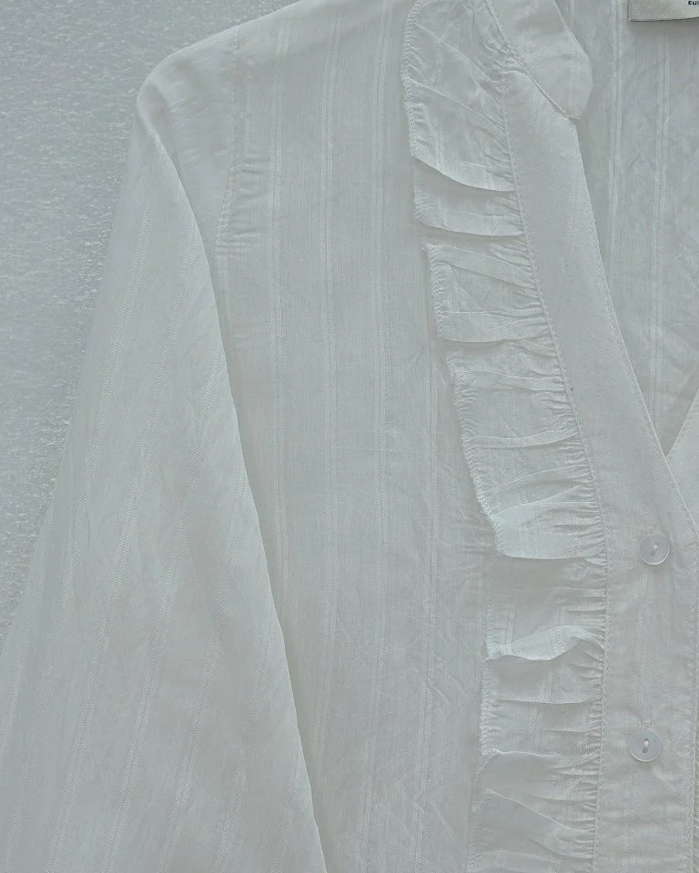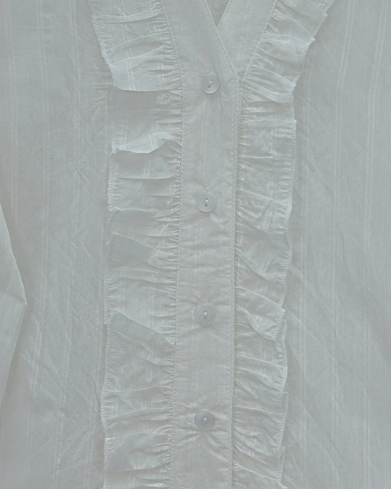 V Yaka Önü Fırfırlı Tensel Yari Transparan Buket Gömlek -Beyaz