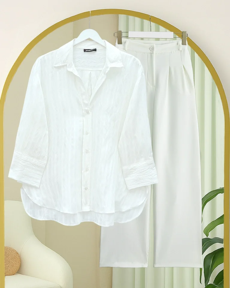 Çizgi Desen Oval Kesim Krinkıl Gömlek -Beyaz