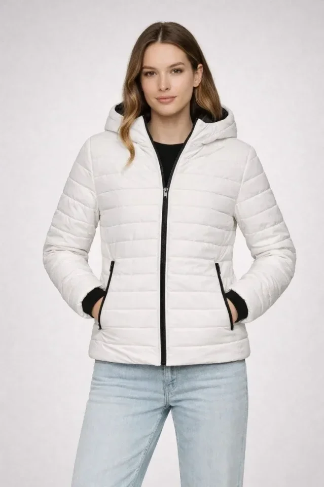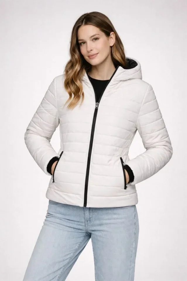 Şişme Kapüşonlu Fermuarlı Mont Su Itici Kapitone Astarlı Kumaş Cepli Kışlık Rahat Kalıp - Krem