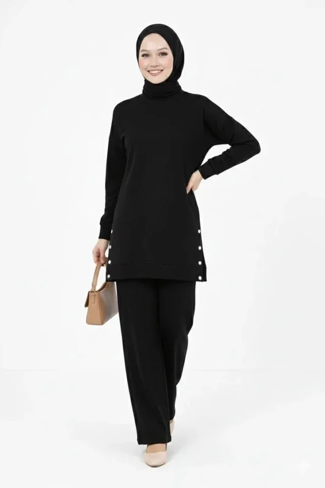 Osy Modal Yumuşak Dokulu Kumaş Modern Tesettür Takım Yandan Metal Çıtçıtlı Uzun Tunik Pantolon Set Salaş Kalıp - Siyah