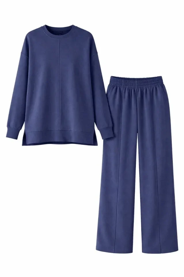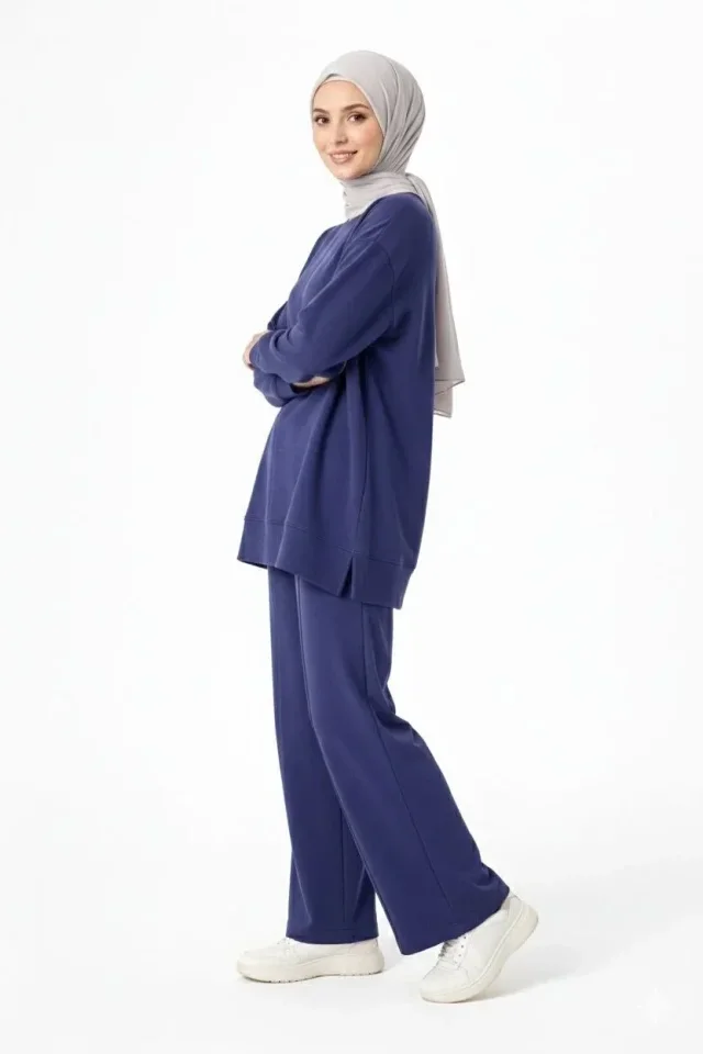 Osy Modal Yumuşak Dokulu Tesettür İkili Takım Yan Yırtmaçlı Uzun Tunik Ve Düz Paça Pantolon, Salaş Kalıp - Lacivert