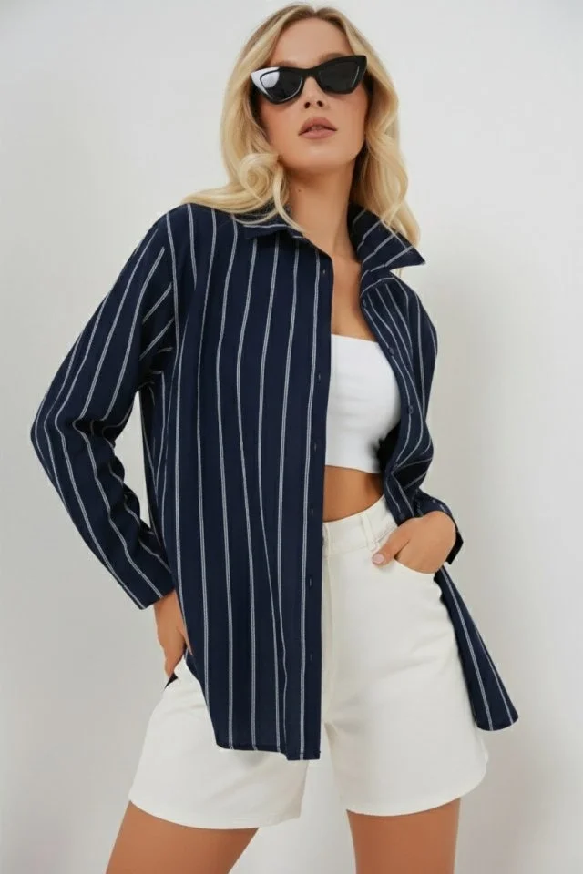 Çizgili Oversize Gömlek 20293 - Lacivert